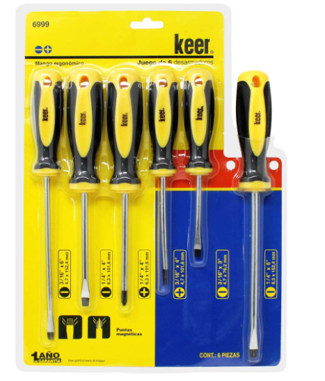 - Desarmadores punta Plana: 3/16″ x 6″, 1/4″ x 4″, 3/16″ x 3″ y 1/4″ x 6″